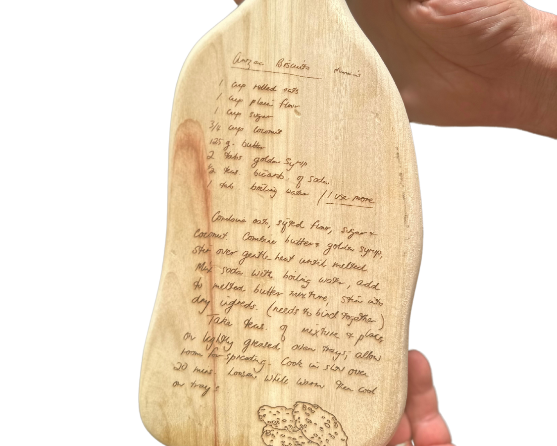 Our keepsake recipe boards are created by carefully tracing your handwritten recipe and engraving it into a beautiful timber board, preserving every detail exactly as it was written. The result is a truly personal piece that brings a loved one’s handwriting back to life, turning something once tucked away on paper into a timeless keepsake. Perfect as a meaningful gift or a piece to display in your kitchen, these boards are made to be treasured for years to come. Fill in the form below and upload your favourite recipe to get started creating your memory to treasure.