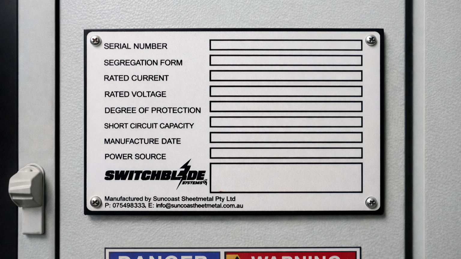 are durable engraved identification plates used on machinery, equipment, trailers and electrical systems to display important information such as serial numbers, specifications, compliance details and manufacturer identification.